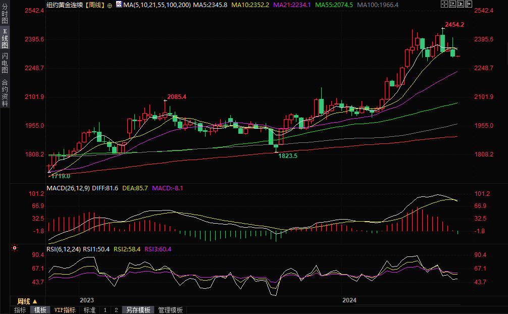 现货黄金目前交投于2295.80美元/盎司附近,上周五下跌3.48%,收报2292.84美元/盎司,周线下跌1.48%。