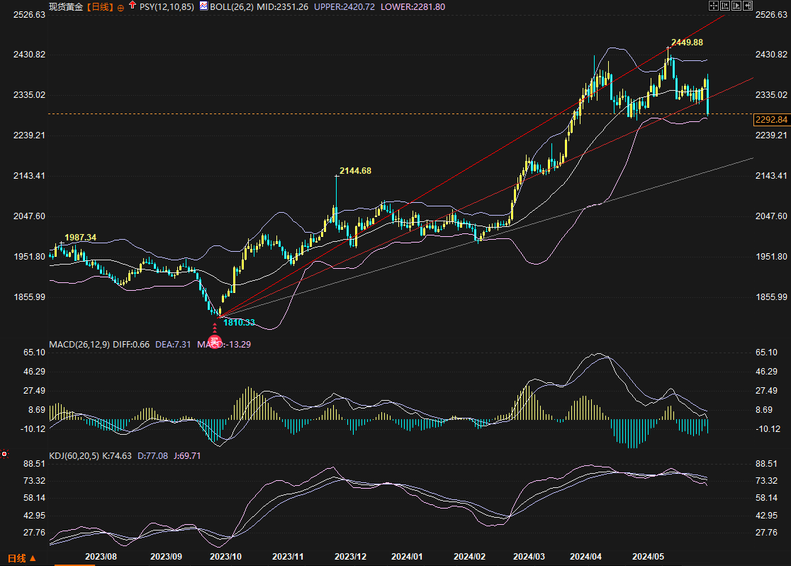 理由是:一方面,日图看,这波跌势是金价5月下旬(23-24日)跌势后的“第二只脚”。从下跌幅度来看已接近"第一只脚",且2286.68接近了前期5月初整理区间底部,需要观察是否会先反弹一波再下跌。同时,日图显示:6月7日的暴跌击穿了最近7个月涨势区间的速阻线中间线,若遇支撑则价格也存在着反弹回测该速阻线阻力的需求。另外,2小时及以下级别的MACD绿柱在缩短,KDJ三线处在超低区域且开始平缓收拢。