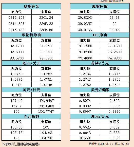 6月11日亚市支撑阻力:金银原油+美元指数等六大货币对