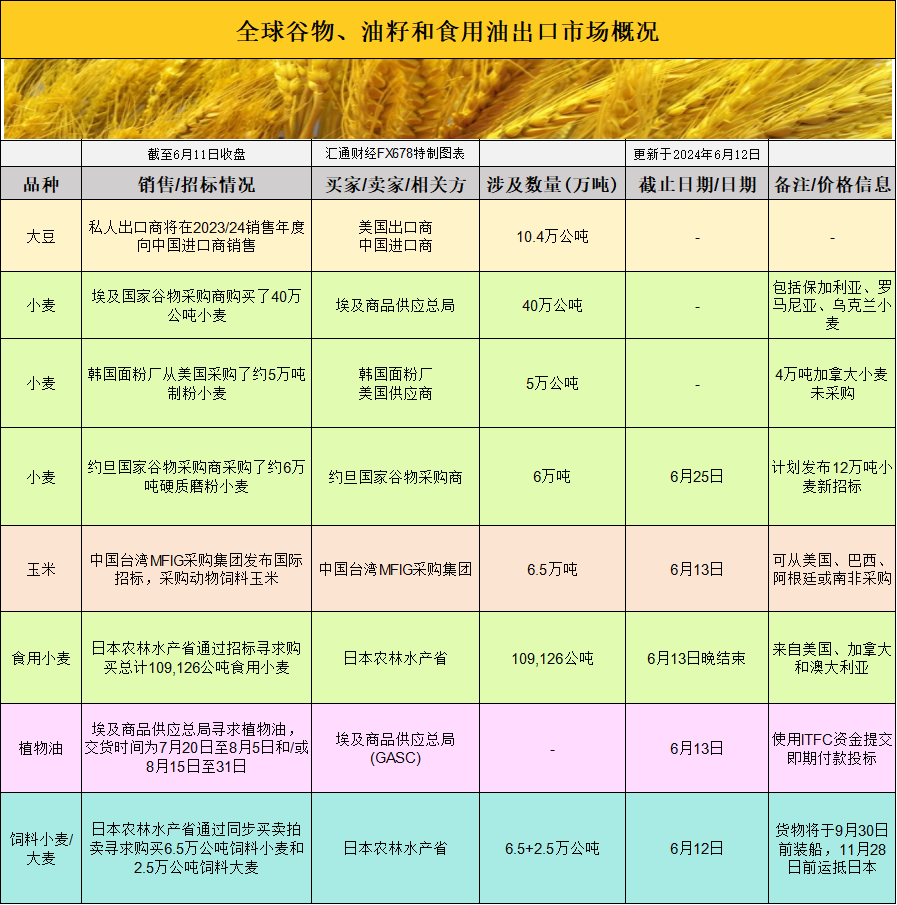 全球谷物、油籽和食用油出口市场招标、采购概况(24年6月12日):