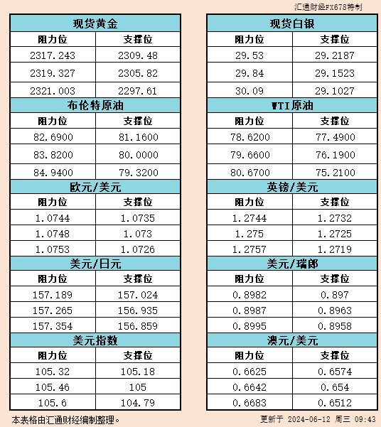 6月12日亚市支撑阻力:金银原油+美元指数等六大货币对