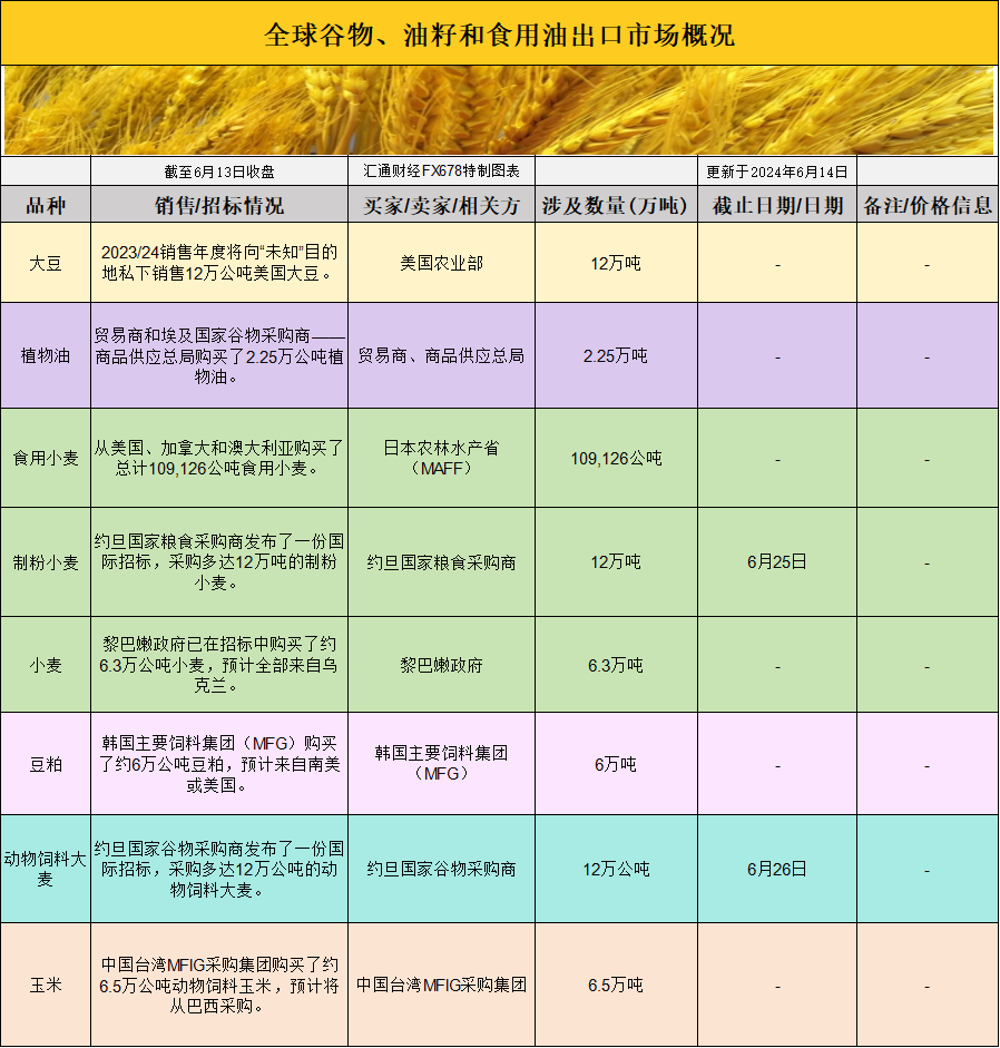 全球谷物、油籽和食用油出口市场招标、采购概况(24年6月14日):