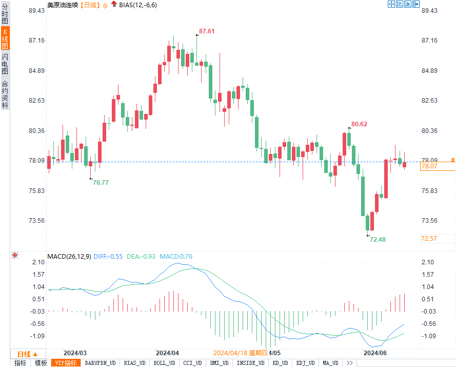截至周五(6月14日)收盘,WTI 7月原油期货小幅下跌0.17美元/桶,收报78.45美元/桶,本周累计涨幅超过3.86%。