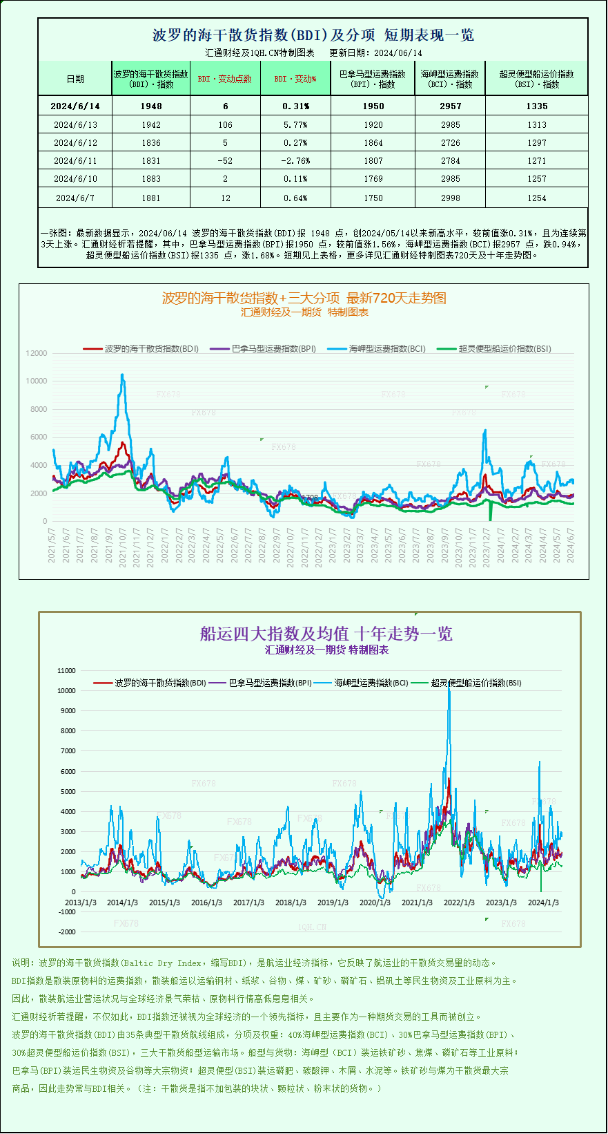 汇通财经APP讯——最新数据显示,2024/06/14波罗的海干散货指数(BDI)报1948点,创2024/05/14以来新高水平,较前值涨0.31%,且为连续第3天上涨。其中,巴拿马型运费指数(BPI)报1950点,较前值涨1.56%,海岬型运费指数(BCI)报2957点,跌0.94%,超灵便型船运价指数(BSI)报1335点,涨1.68%。波罗的海干散货指数+三大分项的最新720天走势图、十年走势图等详见汇通财经特制图表。