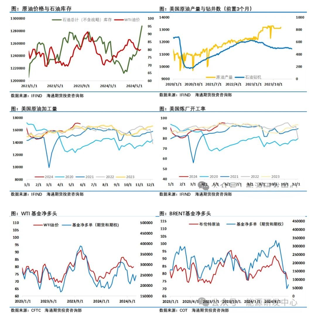 国际能源署IEA6月月报将2024年石油需求增长预测下调10万桶/日至96万桶/日,而美国能源署EIA将2024年全球原油需求增速预期上调18万桶/日至110万桶/日(此前为92万桶/日)。这样的预期调整让市场有些意外,此前美国连续2个月下调了对原油需求预期,而本月月报中又进行的大幅上修;而对需求判断一直为市场质疑的欧佩克,维持2024年和2025年全球原油需求增速预期分别为225万桶/日和185万桶/日不变。不过其还是将2024年第一季度的总石油需求预估值下调5万桶/日,至1.0351亿桶/日;同时将2024年第二季度的预测值上调5万桶/日。并预计下半年全球石油需求增长平均为230万桶/日,欧佩克认为2024年下半年全球服务业将在旅游业的支持下成为经济增长动力的主要贡献者,从而对石油需求产生积极影响。