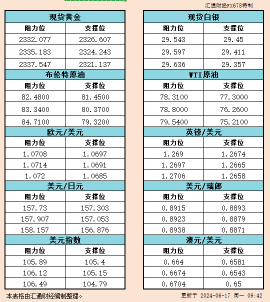 标题:6月17日亚市支撑阻力:金银原油+美元指数等六大货币对