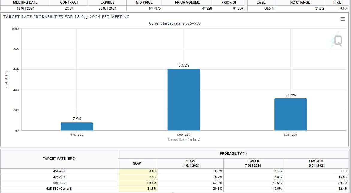 在上周数据显示通胀趋软之后,交易商们增加了他们的押注,预计到12月底会降息大约52个基点(降息两次,每次25个基点)。6月7日的降息预期为37个基点,当时强于预期的就业报告浇灭了提前降息的希望。
