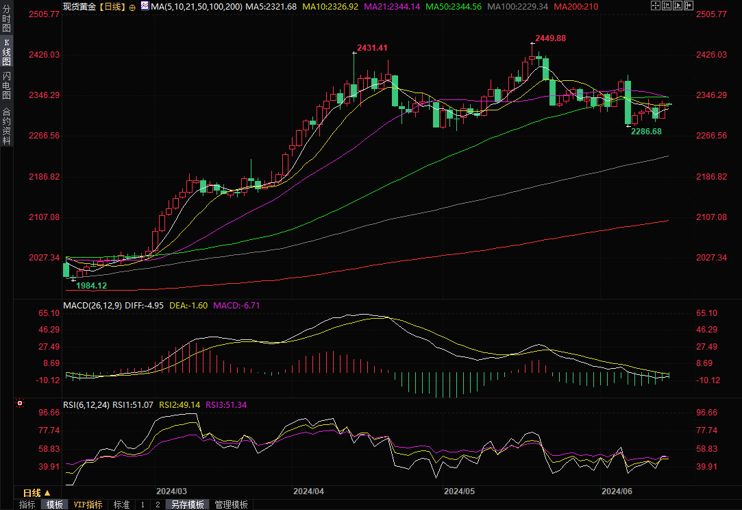 现货黄金上周五(6月14日)收涨1.22%,收报2332.10美元/盎司,全天震荡上行,上周累计上涨1.71%,为四周来首次周线收涨。