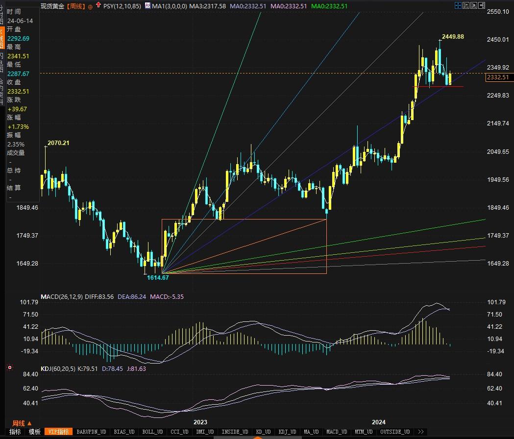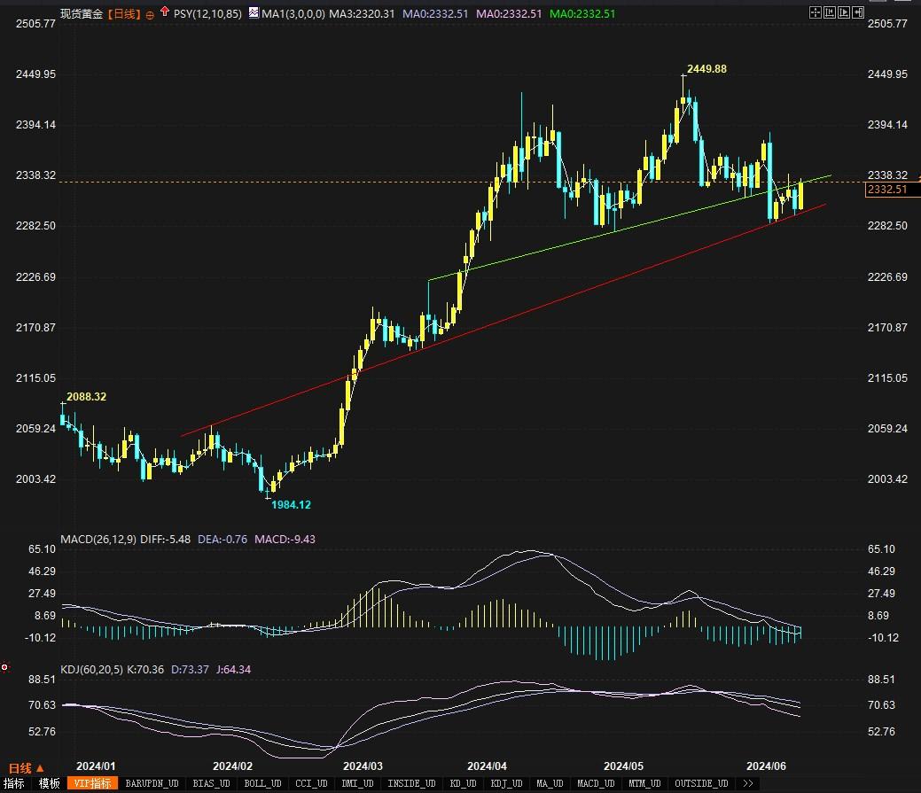 汇通财经APP讯——黄金自6月7日一天暴跌逾100美元之后,连续五天在夹缝中多空拉锯,整体表现出多头尝试反攻的决心:上周(0610-0614当周)金价整体上周收涨了近40美元至2332.51美元/盎司,其实最后一个交易日给了大约75%的贡献度(收涨近30美元)。