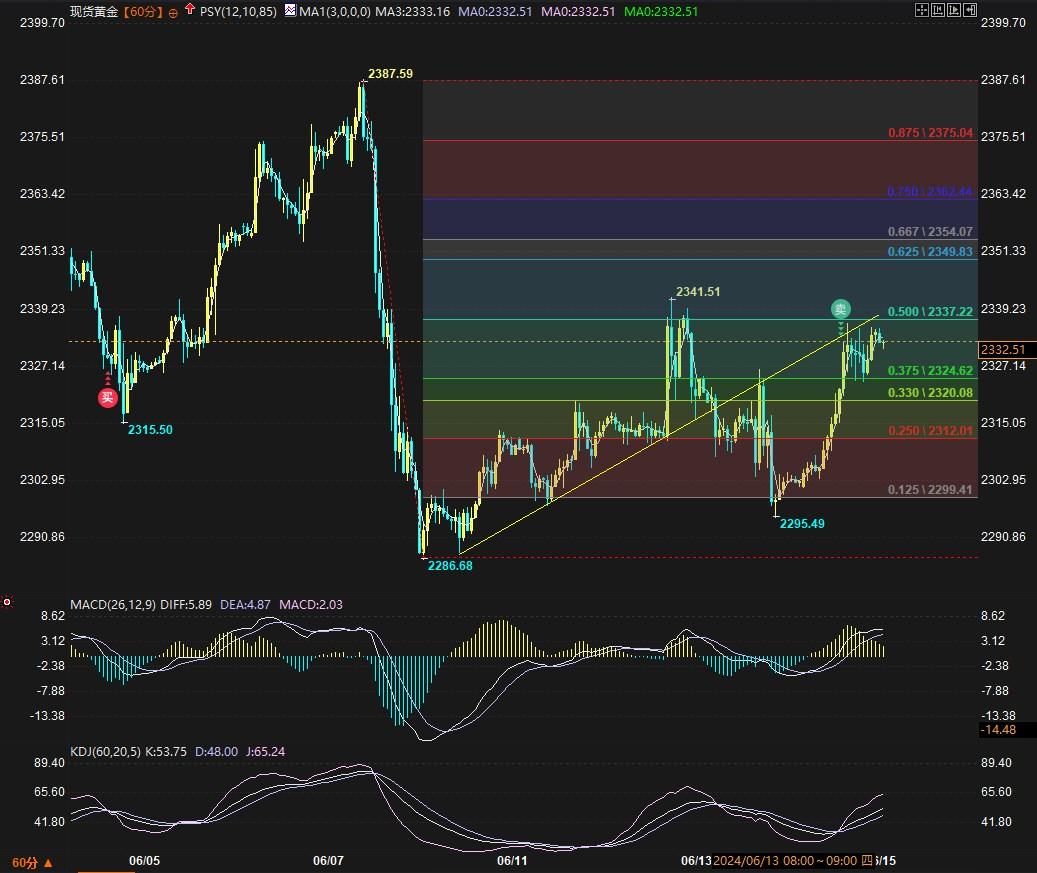 从日图以下的级别看,1小时图显示,金价自2286以来的反弹,持续多次受到2387-2286区间50%回档的压制,周五收盘前再次验证了这种压制但受到了37.5%回档的有效支撑,这也说明多空拉锯较为明显。