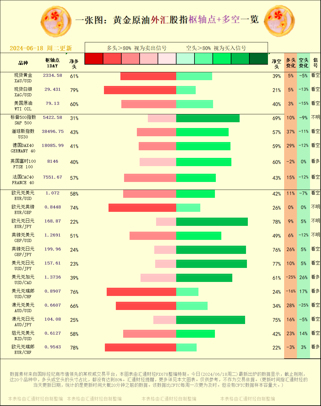 标题:一张图:2024/06/18黄金原油外汇股指"枢纽点+多空占比"一览