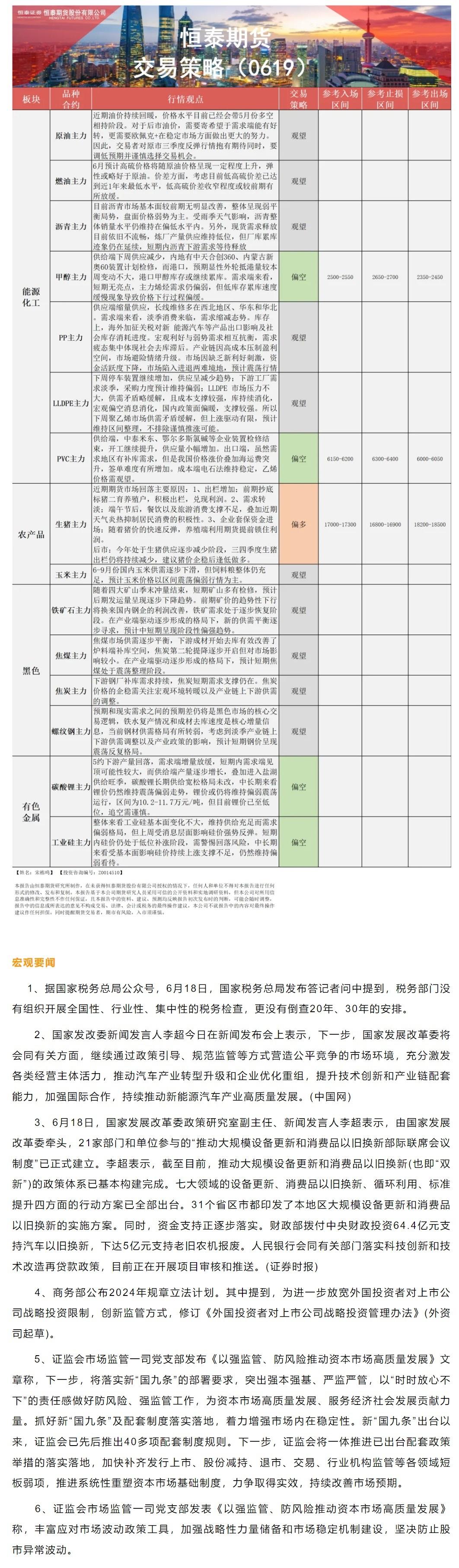 标题:恒泰期货6月19日早间交易策略