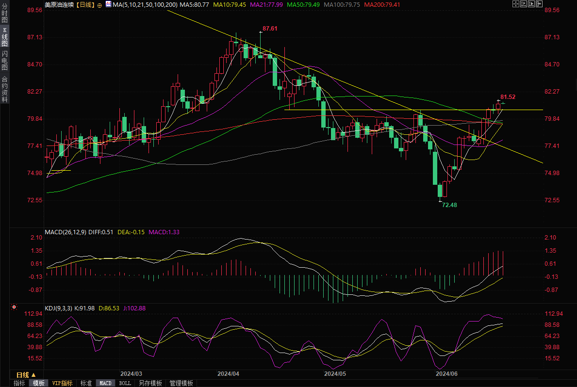 美原油8月期货合约窄幅震荡,目前交投于81.23美元/桶。原油期货周四攀升,此前美国能源信息署(EIA)报告原油库存下降,且数据显示就业市场降温,提振了美联储将提前降息的希望。