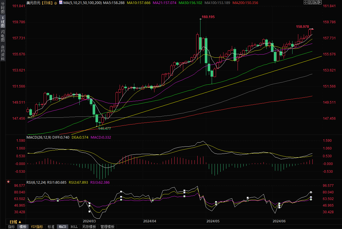 汇通财经APP讯——周五(6月21日),美元/日元上涨逼近159,日本首席货币外交官神田真人表示,如果有必要,他将指示日本央行进行干预,这意味着市场仍需警惕“黑天鹅”事件随时上演。技术分析指出,美元/日元进入超买前,有望突破160大关。