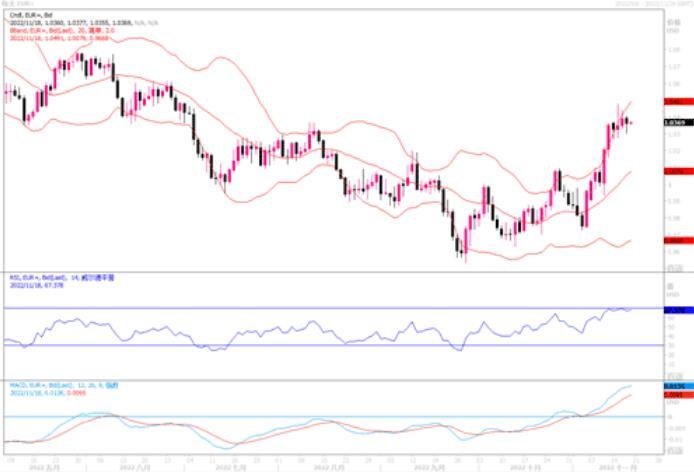 周四(11月17日),欧元对美元略微下跌0.5%,报收于1.0341。据知情人士透露,欧洲央行决策者可能会放慢加息速度,下个月将仅加息50个基点。知情人士提到的理由包括,经济衰退的风险越来越大、消费者价格压力可能会减弱以及将存款利率上调50个基点至2%,将达到接近中性水平,不会再刺激经济。有关这一消息,欧央行的官员未做出回应。距离12月15日欧央行央行今年最后一次决策会议还有四周时间,欧洲央行仍有足够时间做出斟酌。隔夜外汇市场上,虽然上述消息稍不利于欧元,但考虑到美联储也具有减低加息幅度的预期,因此欧元并未因此受到太大的空头冲击。日图显示在1.05关口前,欧元多头遇阻显得上冲力不够,随机指标倾向自超买区域回落,短线警惕回调风险。4小时图高位剧烈拉锯,上行未能再创新高。小时图波幅有所收敛,三角形态即将突破。短线还是要主防冲高回落风险,下方关键的支撑在1.03这个前期横盘区间上沿,若跌穿或就宣告欧元此轮反弹失败。相反,若能坚守在上述水平之上,则后市存在继续尝试冲击1.05的可能性。