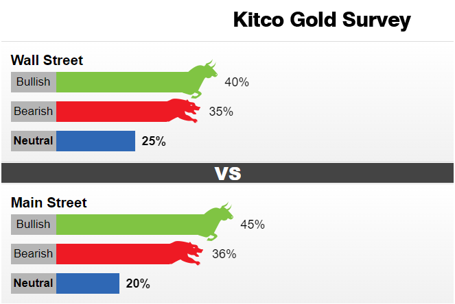 上周调查显示,分析师和散户对黄金后市走势的分歧明显加大。20位华尔街分析师参加了Kitco的黄金调查,在受访者中,有8位分析师(40%)预计看涨后市,7位分析师(35%)看空后市,5位分析师(25%)持中性看法。