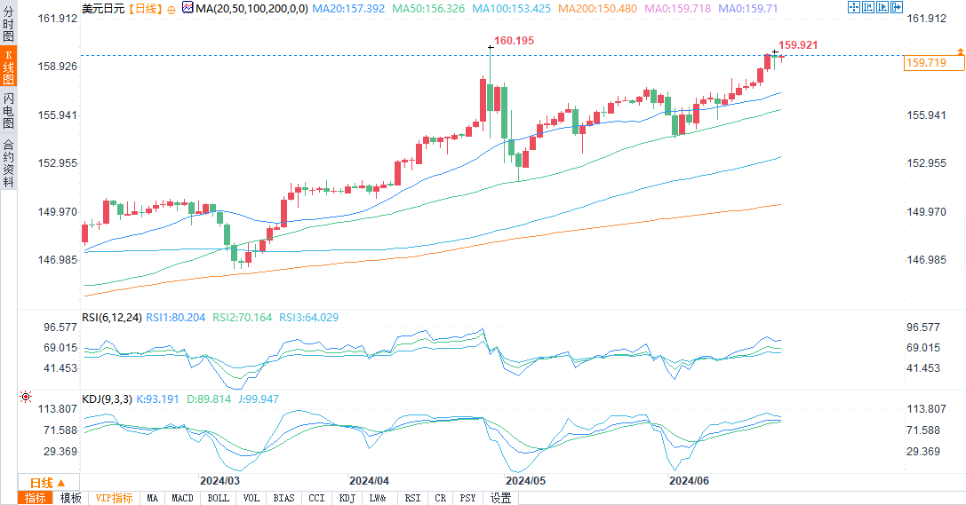 汇通财经APP讯——周二(6月25日)纽约时段,美元/日元保持稳定,交投于159.720附近,涨幅0.08%。以下是对美元/日元、欧元/日元、英镑/日元三组货币对的技术分析。