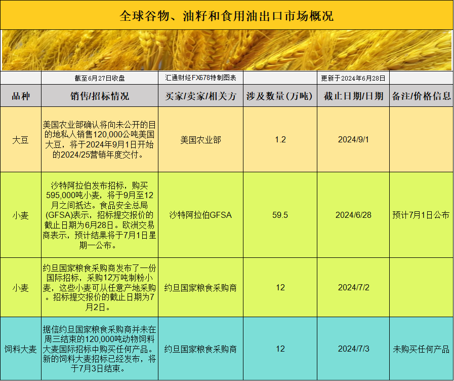 美国农业部(USDA)的数据显示,截至6月20日当周,旧作大豆出口销售量为282,900吨,低于贸易预期的30万至60万吨。这一需求低迷的情况并未影响基差报价,6月份装载的大豆价格仅比CBOT 7月期货每蒲式耳高出66美分,较周三下跌1美分。一位经纪人指出:“需求不足,是市场淡静的主要原因。”