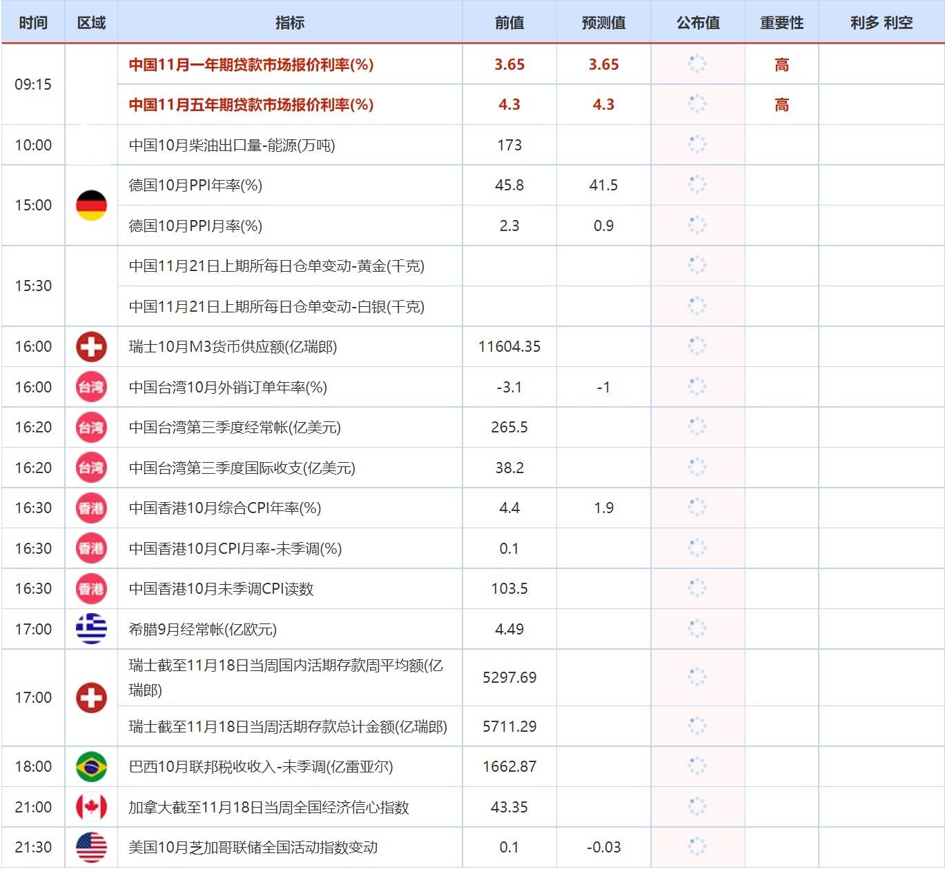09:15 中国11月五年期贷款市场报价利率(%) , 前值 4.3 , 预期值 4.3 , 公布值:待发布10:00 中国10月柴油出口量-能源(万吨) , 前值 173 , 预期值 -- , 公布值:待发布15:00 德国10月PPI年率(%) , 前值 45.8 , 预期值 41.5 , 公布值:待发布15:00 德国10月PPI月率(%) , 前值 2.3 , 预期值 0.9 , 公布值:待发布