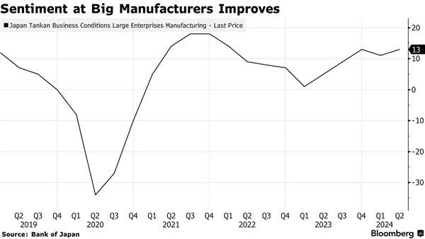 日本大型制造商的信心较三个月前上升,为日本央行7月加息提供数据支撑