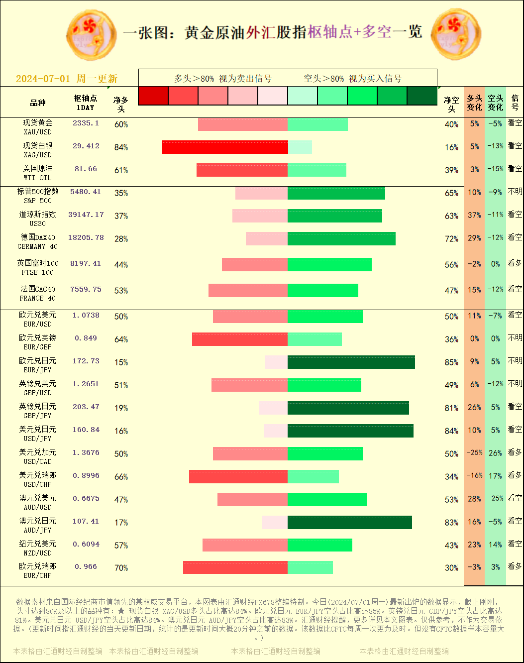 一张图:2024/07/01黄金原油外汇股指"枢纽点+多空占比"一览