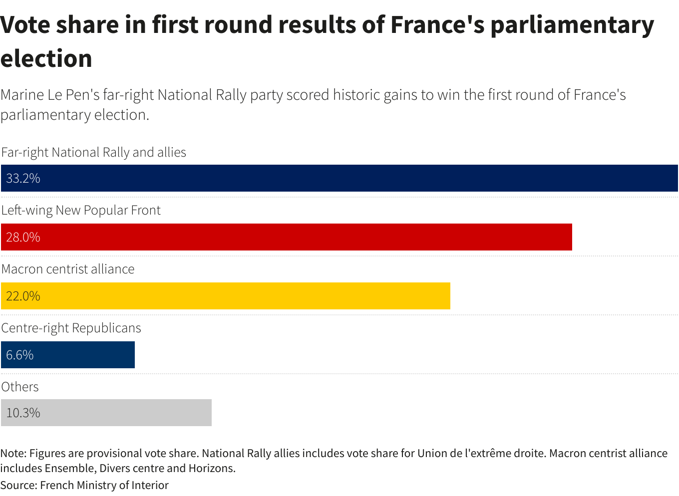 官方结果显示,国民联盟及其盟友在周日的选举中获得33%的支持票,左翼集团以28%的支持率紧随其后,远远领先于总统马克龙广泛的中间派联盟,后者的支持率仅为22%。