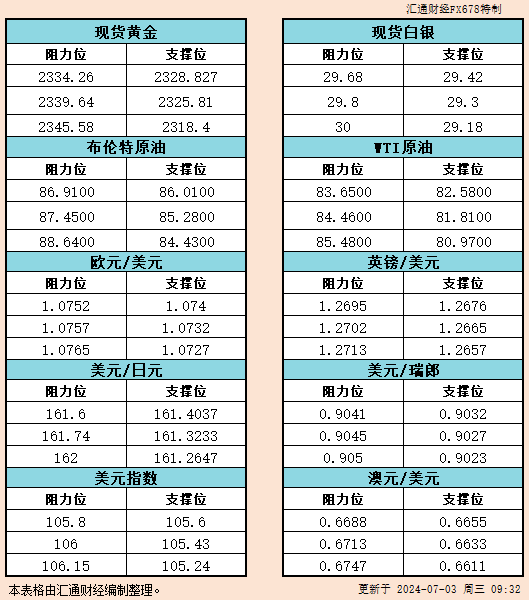 7月3日亚市支撑阻力:金银原油+美元指数等六大货币对