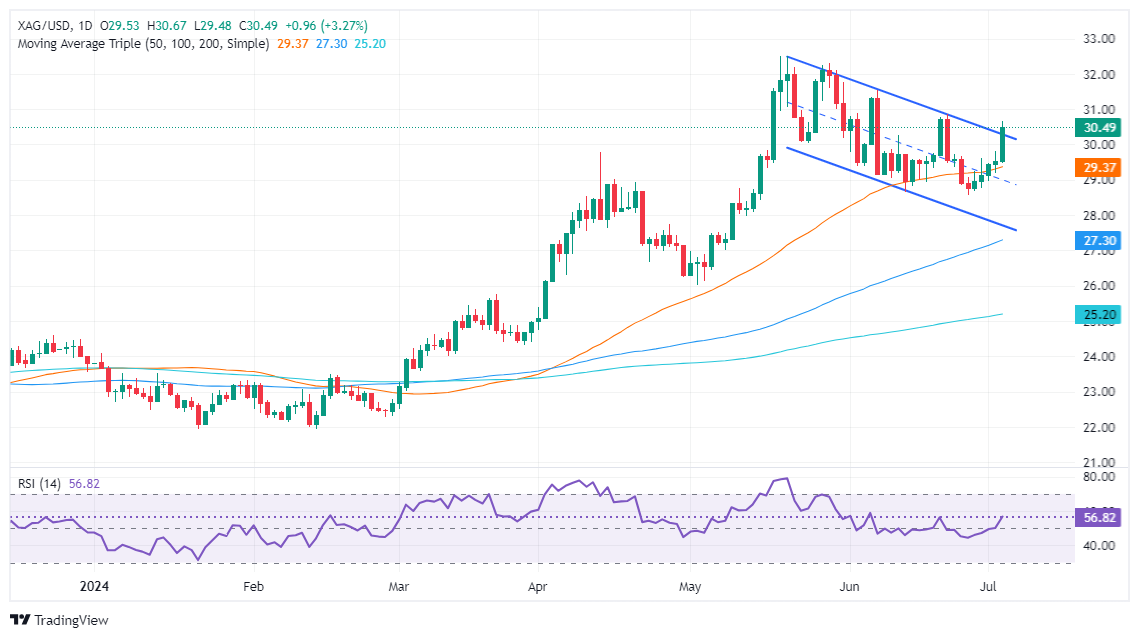 周三(7月3日),现货白银暴涨逾3%,已经突破30.00美元/盎司大关。FXStreet分析师Christian Borjon Valencia最新撰文,对银价技术走势进行分析。