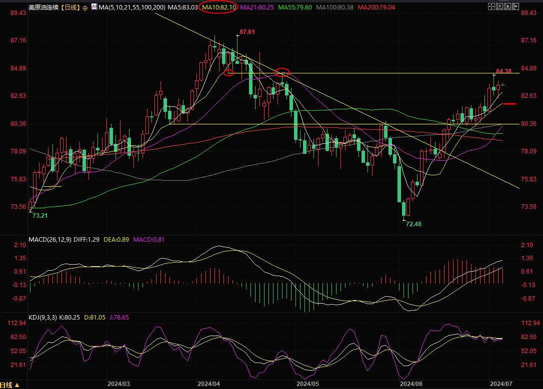 技术面来看,美原油短线偏向高位震荡筑顶,留意82.10-84.46区域突破情况,前者是10日均线支撑,后者是4月26日高点阻力。
