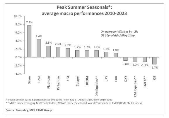 他们表示:“从7月4日到劳动节,贵金属在夏末通常表现强劲,白银(+7.7%)和黄金(+4.4%)表现强劲,因为宏观投资者从主流资产中撤退(发达市场股票小幅上涨,而美国债券通常下跌,美元通常下跌0.8%)。”“黄金/白银的这种季节性强势可以部分归因于过去围绕杰克逊霍尔的鸽派预期、2011年欧洲危机和COVID货币应对措施(导致7月/8月左右的数据出现偏差),以及在9月季节性实物需求回升之前的先发制人购买。新兴市场资产(从EMFX到股票)传统上在这个夏季高峰期面临阻力。”