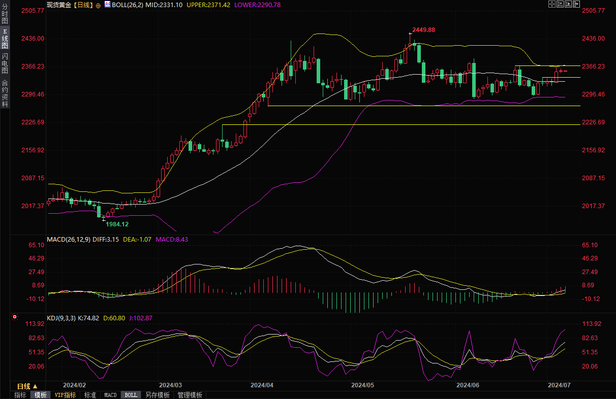 现货黄金窄幅震荡,目前交投于2356.47美元/盎司附近。周四是美国独立日较强,金价上一交易日提前休市,整体维持窄幅震荡走势,收报2356.80美元/盎司,K线录得十字星。本交易日将出炉美国6月就业报告,市场观望情绪渐浓。