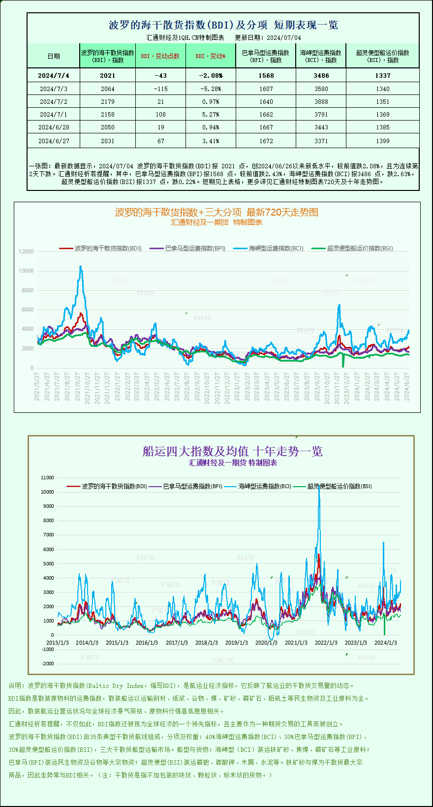 汇通财经APP讯——最新数据显示,2024/07/04波罗的海干散货指数(BDI)报2021点,创2024/06/26以来新低水平,较前值跌2.08%,且为连续第2天下跌。其中,巴拿马型运费指数(BPI)报1568点,较前值跌2.43%,海岬型运费指数(BCI)报3486点,跌2.63%,超灵便型船运价指数(BSI)报1337点,跌0.22%。波罗的海干散货指数+三大分项的最新720天走势图、十年走势图等详见汇通财经特制图表。