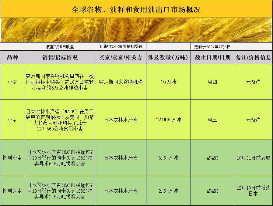 全球谷物、油籽和食用油出口市场招标、采购概况显示,欧洲贸易商称突尼斯国家谷物机构购买了约10万公吨软小麦和约5万公吨硬粒小麦。日本农林水产省(MAFF)在周三结束的定期招标中从美国、加拿大和澳大利亚购买了总计129,660公吨食用小麦。日本农林水产省(MAFF)表示,将通过7月10日举行的同步买卖(SBS)拍卖寻求6.5万吨饲料小麦和2.5万吨饲料大麦。
