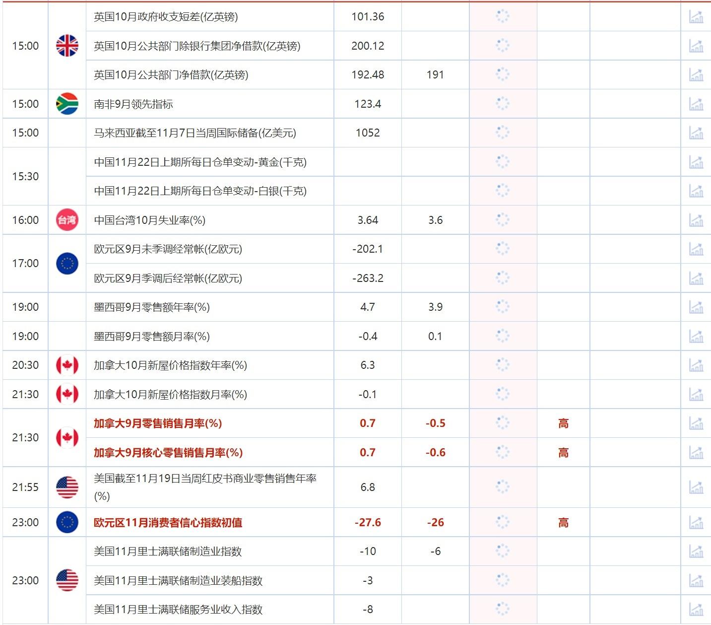 21:30 加拿大9月核心零售销售月率(%) , 前值 0.7 , 预期值 -0.6 , 公布值:待发布21:55 美国截至11月19日当周红皮书商业零售销售年率(%) , 前值 6.8 , 预期值 -- , 公布值:待发布