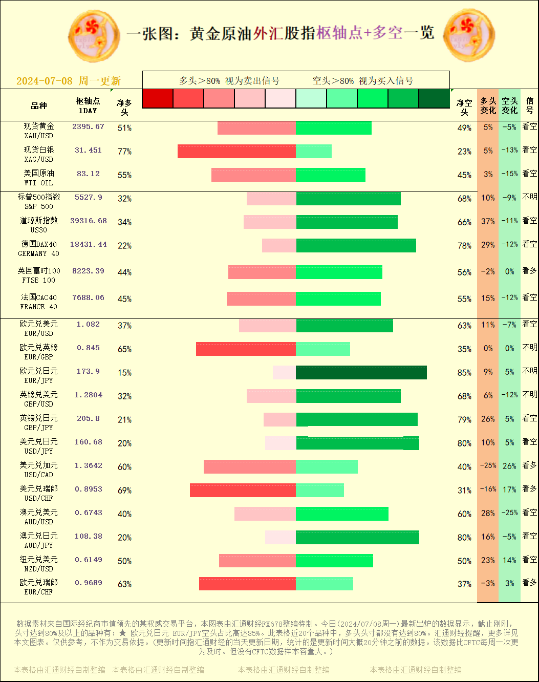 一张图:2024/07/08黄金原油外汇股指"枢纽点+多空占比"一览