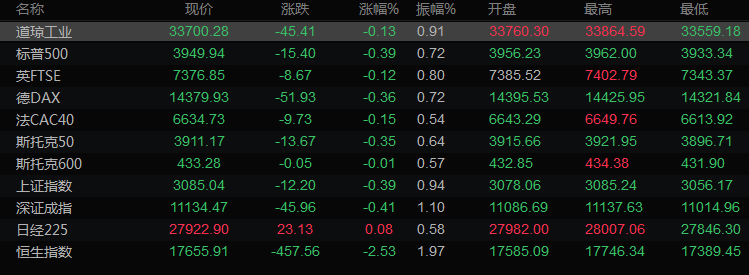 美股收盘情况:道琼斯工业指数下跌0.13%,至33700.28点;