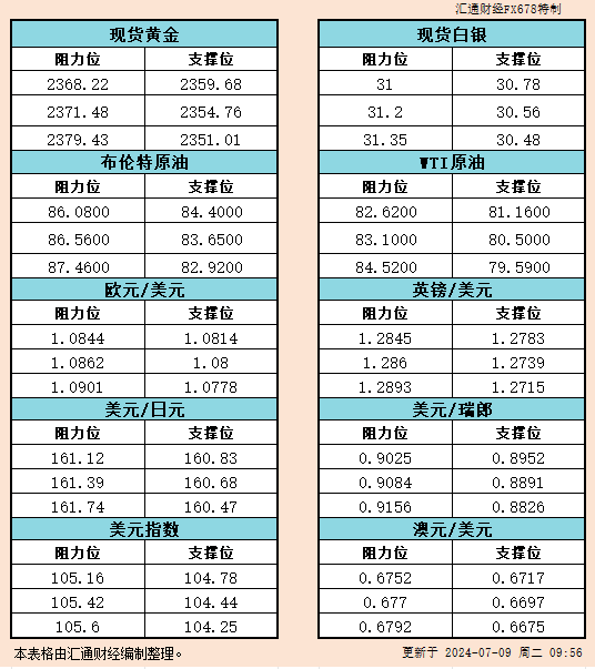 7月9日亚市支撑阻力:金银原油+美元指数等六大货币对