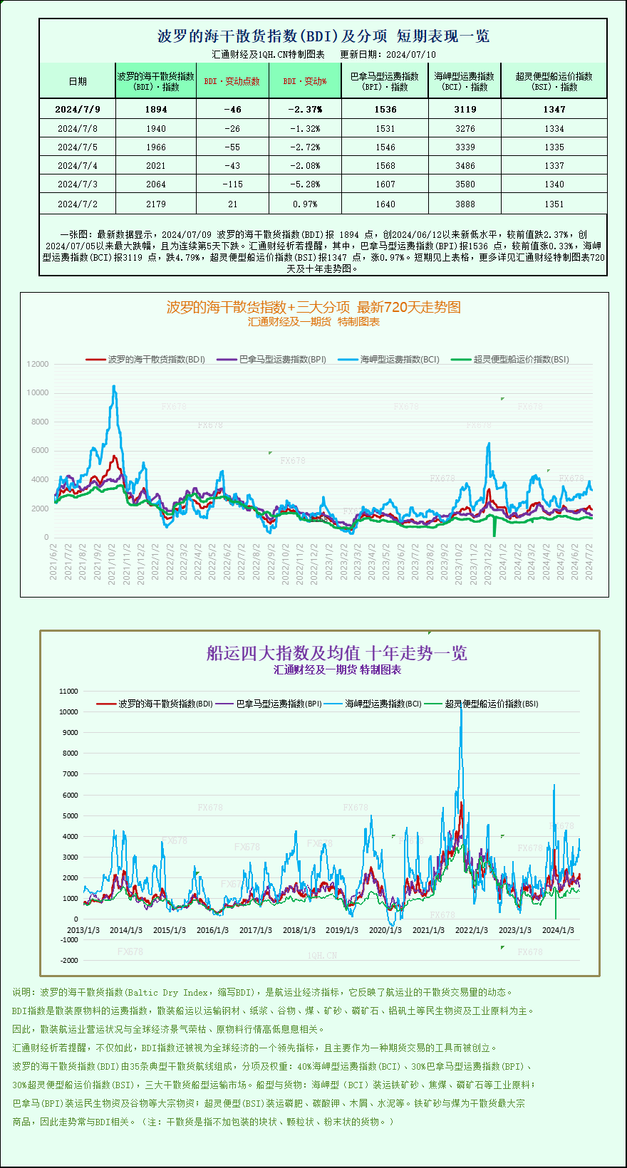 汇通财经APP讯——最新数据显示,2024/07/09波罗的海干散货指数(BDI)报1894点,创2024/06/12以来新低水平,较前值跌2.37%,创2024/07/05以来最大跌幅,且为连续第5天下跌。其中,巴拿马型运费指数(BPI)报1536点,较前值涨0.33%,海岬型运费指数(BCI)报3119点,跌4.79%,超灵便型船运价指数(BSI)报1347点,涨0.97%。波罗的海干散货指数+三大分项的最新720天走势图、十年走势图等详见汇通财经特制图表。