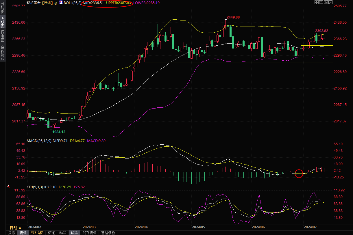 不过MACD金叉信号仍在,若金价强势顶破布林线上轨2387.83附近阻力,则有望启动新一轮上涨,进一步阻力参考2400关口,甚至有望向历史高点2449.88附近位置发起冲击。