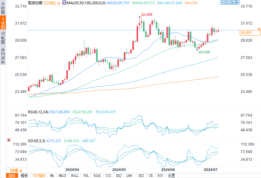 现货白银期货多头近期整体技术优势稳固。白银多头的下一个上行目标是收于技术阻力位33.05美元上方。空头的下一个下行目标是收于6月低点28.90美元的坚实支撑下方。第一个阻力位见于上周的高点31.79美元,然后是32.00美元。下一个支撑位见于本周低点30.71美元,然后是30.45美元。