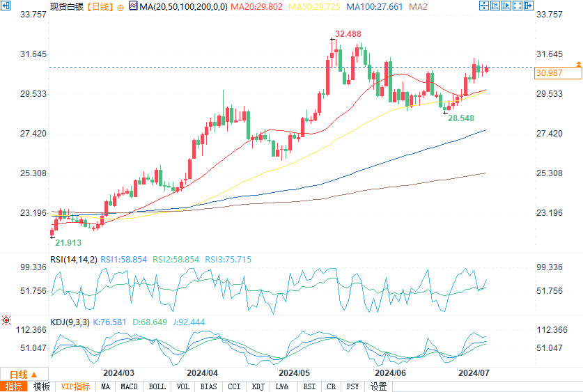 周三(7月10日)欧市盘中,受美国联邦储备委员会(Federal Reserve)主席鲍威尔近期言论和对美国重要通胀报告的预期提振,银价走高,盘中突破31美元。市场对关键技术位表现出强烈的尊重,表明短期前景看涨。