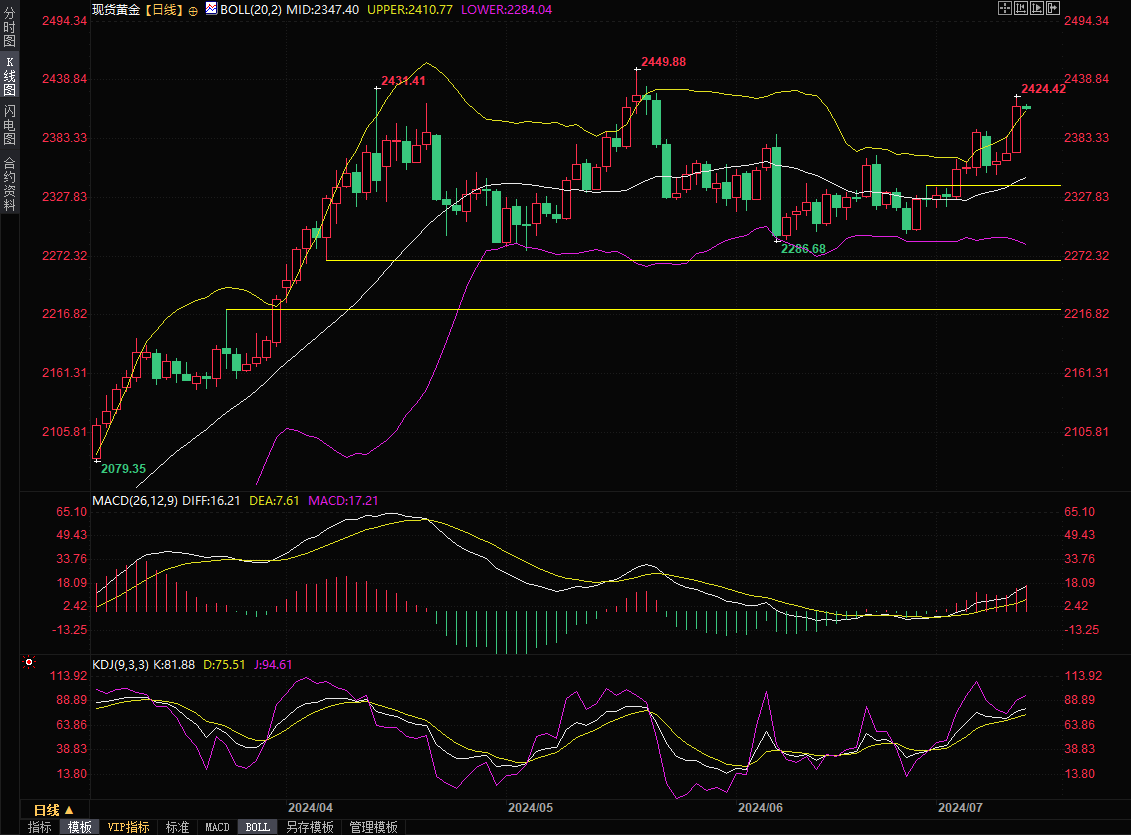 技术面来看,金价顶破了2400关口,布林线开口,MACD金叉信号延续,KDJ向上发散,短线看涨信号有所增强,后市偏向上调历史高点2450关口附近阻力,下方2400关口已经转化为初步支撑所在,7月5日高点2392.82是进一步支撑所在,若意外回落至该位置下方,则削弱后市看涨信号。