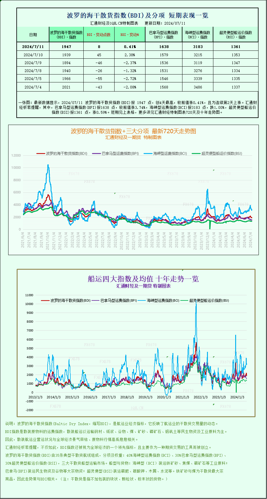 汇通财经APP讯——最新数据显示,2024/07/11波罗的海干散货指数(BDI)报1947点,创4天最高,较前值涨0.41%,且为连续第2天上涨。其中,巴拿马型运费指数(BPI)报1638点,较前值涨3.74%,海岬型运费指数(BCI)报3183点,跌1.00%,超灵便型船运价指数(BSI)报1361点,涨0.59%。波罗的海干散货指数+三大分项的最新720天走势图、十年走势图等详见汇通财经特制图表。