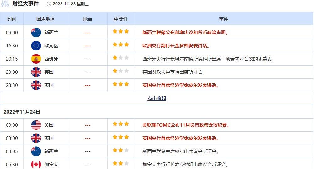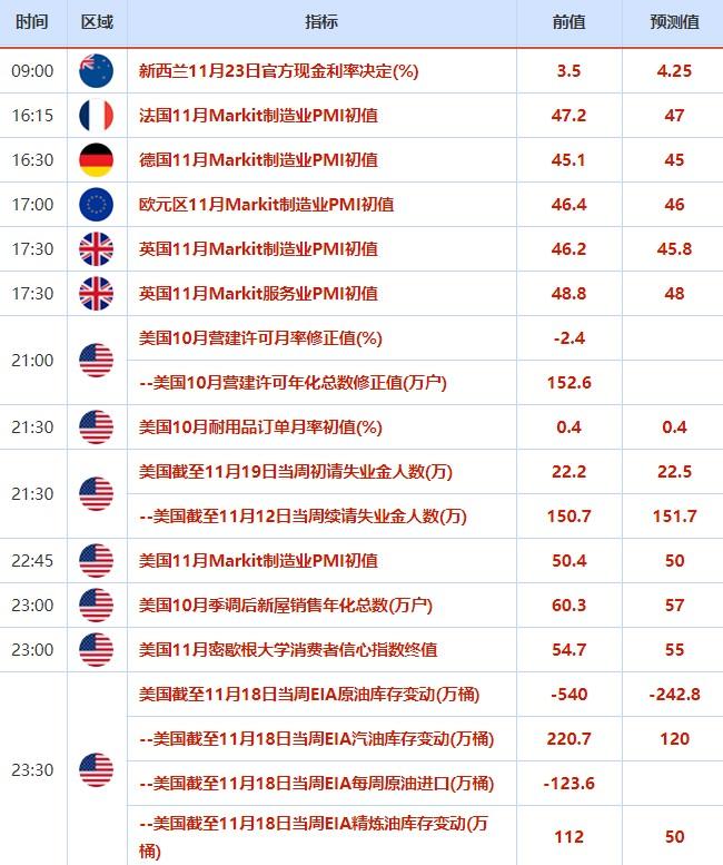本交易日经济数据和风险事件较多,重点关注新西兰联储利率决议和美联储会议纪要,市场预计新西兰联储将加息75个基点。数据方面,关注欧美国家11月PMI数据、美国10月耐用品订单月率初值和初请失业金人数变动。市场对欧元区PMI数据的预期不佳,偏向利多美元。