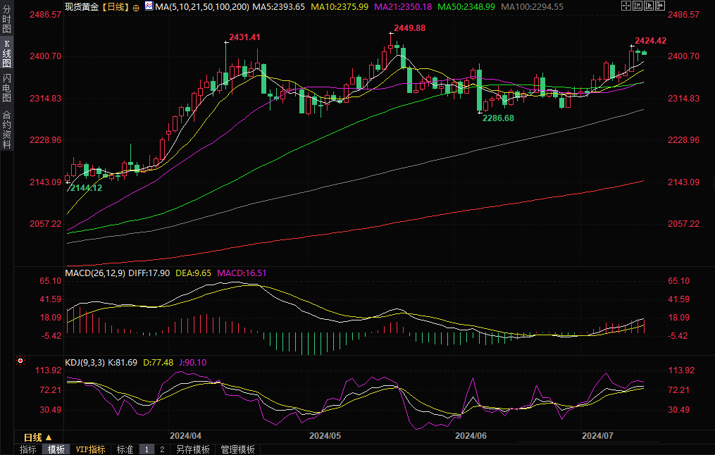 汇通财经APP讯——上周五(7月12日),国际黄金守在关键的2400美元/盎司关口上方,并连续第三周上涨,因投资者对美联储即将降息的信心增强。