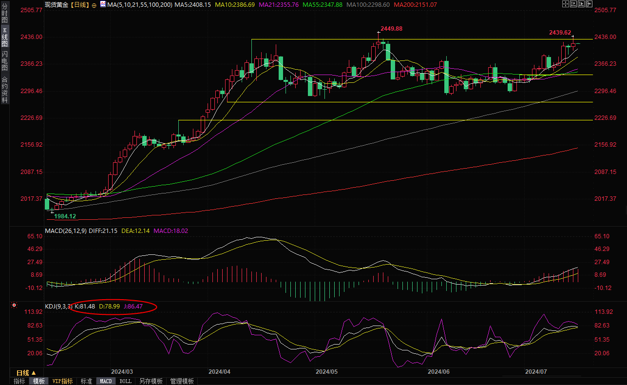 根据芝商所(CME)的FedWatch工具,市场目前认为美国9月降息的可能性为100%。2439.62是自5月20日以来的最高水平,当时金价创下每盎司2449.89美元的纪录高位。