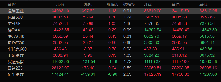 美股收盘情况:道琼斯工业指数上涨1.18%,至34098.1点;