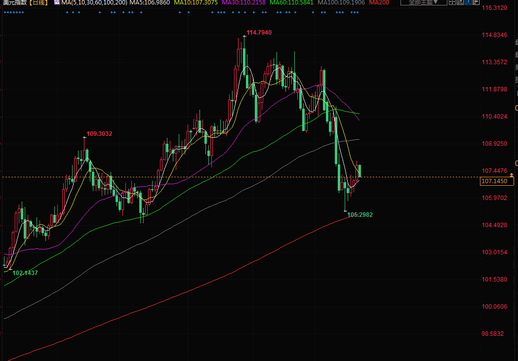 美元指数交投于107.16附近;周二美元回落,回吐了上一交易日的部分涨幅,因为投资者提振了对风险较高货币的需求,股市、大宗商品和风险较高货币大多走强,对全球经济前景的担忧增加。;金价持于上一交易日触及的低位上方,美元和指标美债收益率回落与股市上涨基本相抵,投资者在等待有关美联储货币政策路径的线索。油价周二上涨超1%,此前全球最大石油出口国沙特表示OPEC+坚持减产,并可能采取进一步措施平衡市场支撑油价。