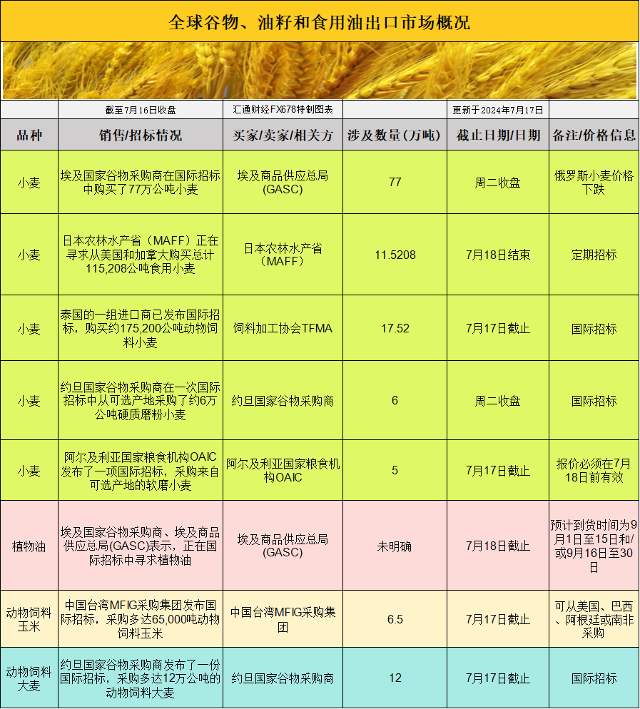 小麦市场则呈现出不同的动态。埃及国家谷物采购商在国际招标中购买了77万公吨小麦,其中大部分是俄罗斯小麦,这是自2022年以来俄罗斯小麦价格下跌后该国最大的单笔采购。此外,日本农林水产省(MAFF)正在寻求购买总计115,208公吨食用小麦,而泰国的一组进口商已发布国际招标,购买约175,200公吨动物饲料小麦。这些招标活动反映了小麦市场的活跃度。
