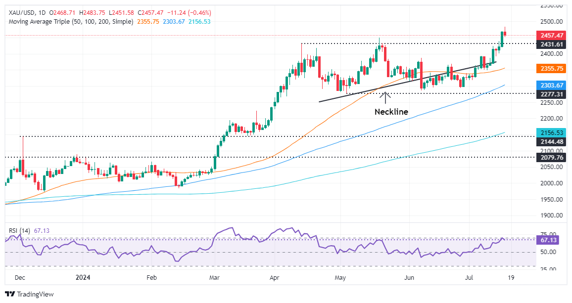 周三(7月18日)纽约时段,现货黄金出现大跌行情,金价自时段内触及的历史高位大跌逾30美元,一度逼近2450美元/盎司关口。